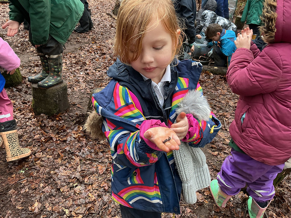The session also explored the importance of healthy soil. The children investigated the forest floor, carefully searching for the tiny creatures that help keep our planet in balance. They were delighted to discover worms, woodlice, spiders and snails busily at work beneath their feet.